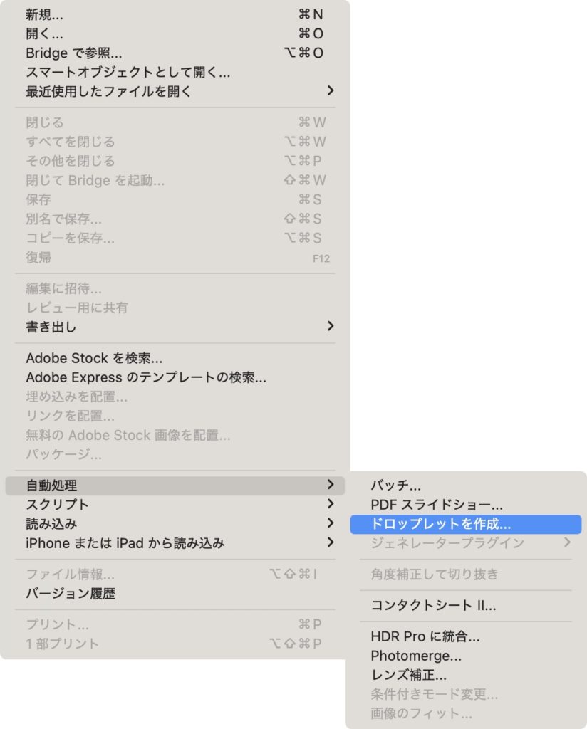 【ファイル】>[自動処理]>[ドロップレットを作成…]を選択します。